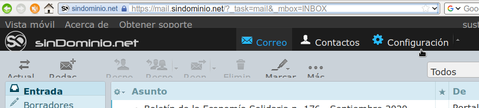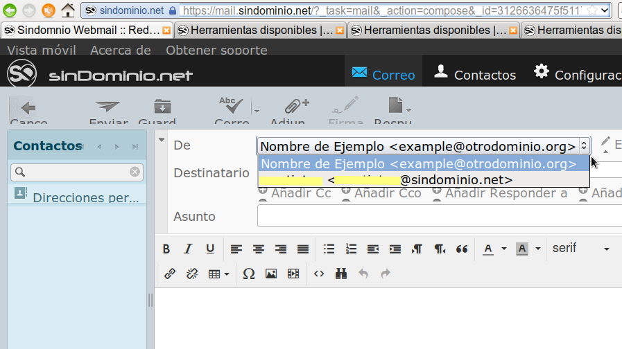 - Cuando hayas metido todos los datos, dar al botón Guardar y listo!! Ya podrás utilizar el email con tu nombre de dominio. Si vas a Correo, y pinchas en el botón de crear un mensaje nuevo, verás que tu email example@otrodominio.org aparecerá por defecto en el campo “De”, y que habrá una lista desplegable en la que podrías seleccionar para utilizar el email de Sindominio, si fuera necesario…