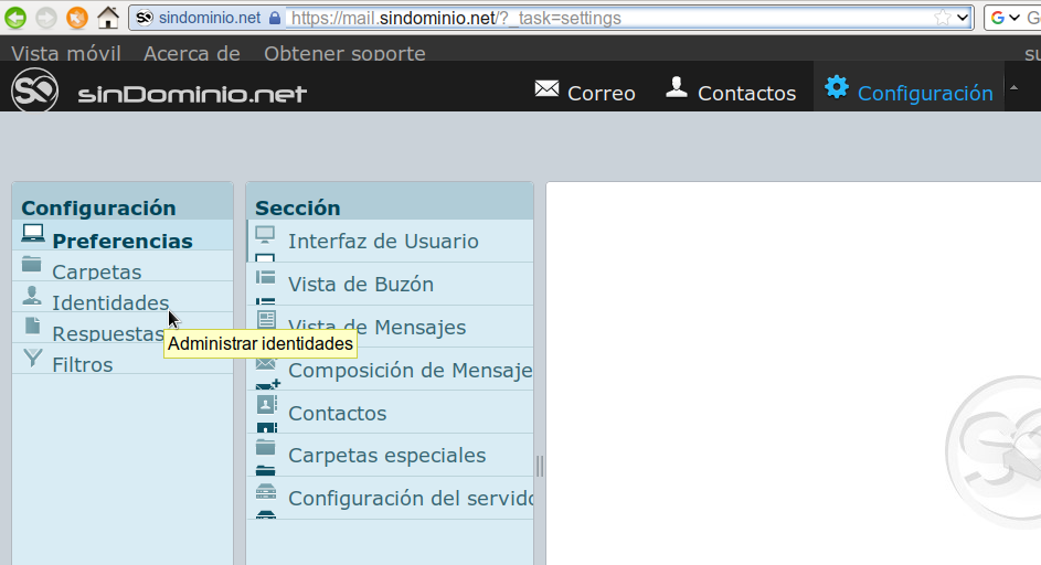 (Las siguientes imágenes se han hecho con el tema por defecto del webmail, si se ha cambiado el tema, los enlaces y tal están en otros sitios, pero el nombre parece que se mantiene):