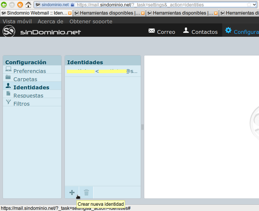 - En la columna “Identidades” te aparecen las identidades que tienes creadas. Si no la has tocado nunca, solo habrá una, tu correo example@sindominio.net. Vamos a crear una nueva. Para eso pinchar en el botón con un símbolo mas de la parte de abajo, como en la imagen.