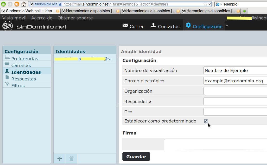Establecer como predeterminado: Que esté seleccionado, como en la imagen, para que se utilice por defecto esta identidad, y no la original de Sindominio.