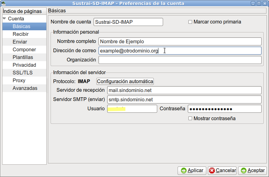Correo electrónico: La dirección que quieres utilizar en lugar de la de Sindominio, en el ejemplo sería: example@otrodominio.org.