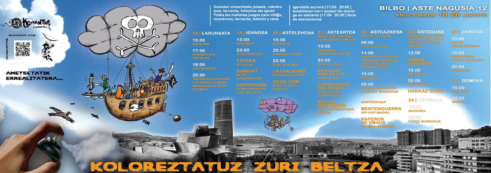 Este próximo martes día 21 de agosto y dentro del programa de actividades que Bilboko Konpartsak organiza en Aste Nagusia, Irola y Tas-Tas Irratia hemos organizado una emisión especial de 12:00h a 14:00h y de 16:00h a 18:00h. En directo y desde el Arenal podremos disfrutar de esta emisión en la que participarán, como no, personas de las dos Radios Libres de Bilbo y en la que podremos escuchar a representantes de las Konparsas hablando sobre los dos años de veto a Txori Barrote y Kaskagorri, la nueva ordenanza del espacio publico, el modelo festivo del Bilbo y otras muchas mas cosas que esperamos resulten enriquecedoras.